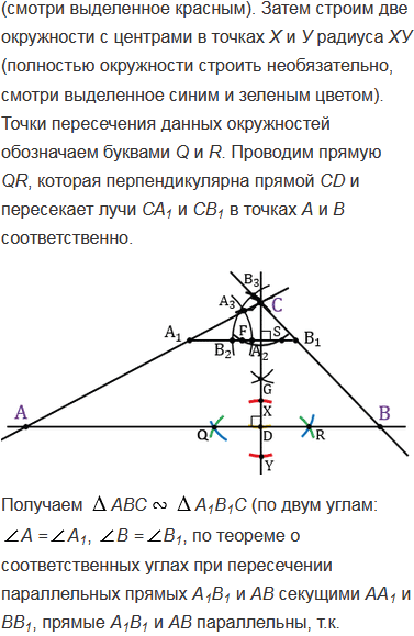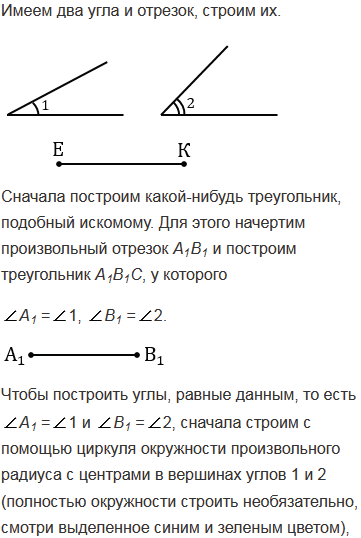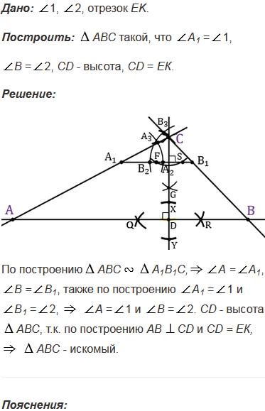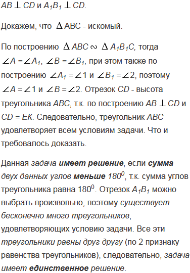 Постройте треугольник по двум углам и высоте, проведенной из вершины третьего угла.