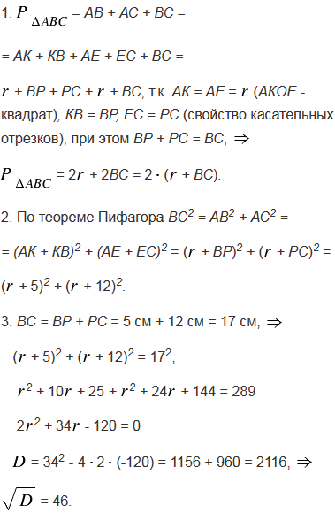 = 4 см; б) точка касания делит гипотенузу на отрезки, равные 5 см и 12 см.