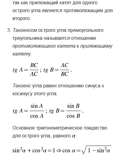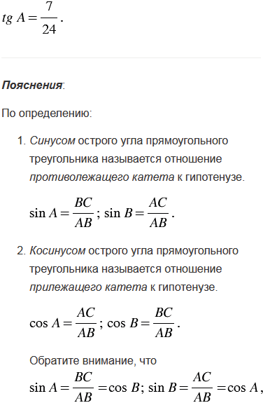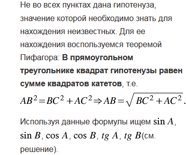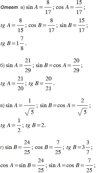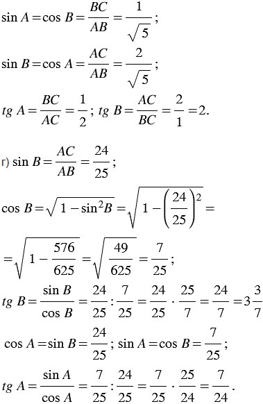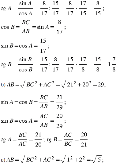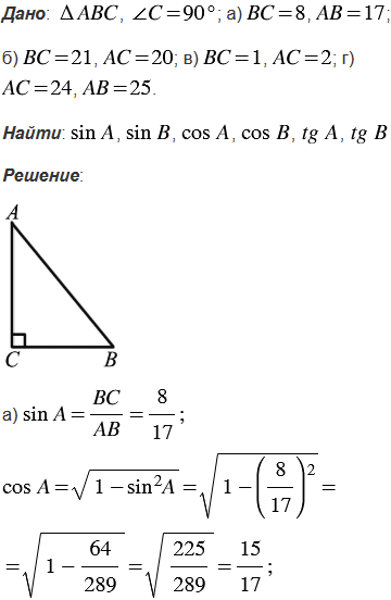Найдите синус, косинус и тангенс углов А и В треугольника АВС с прямым углом С, если: а) ВС = 8, АВ = 17; б) ВС = 21, АС = 20; в) ВС = 1, АС = 2; г) АС = 24, АВ = 25.
