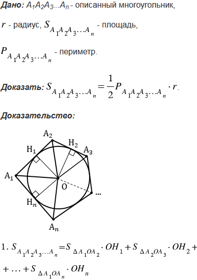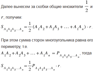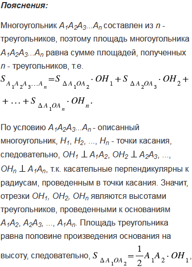 Докажите, что площадь описанного многоугольника равна половине произведения его периметра на радиус вписанной окружности.