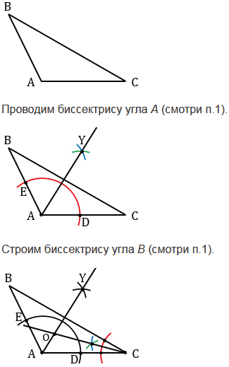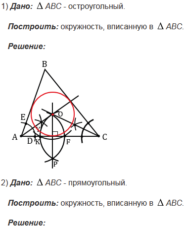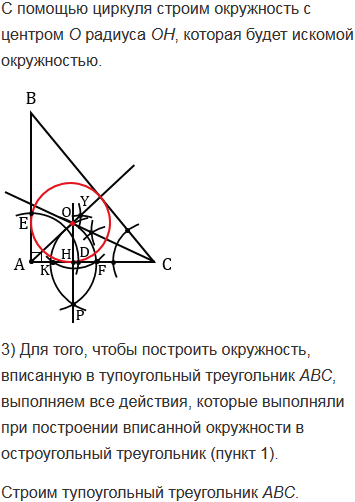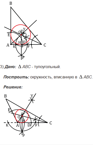 Начертите три треугольника: остроугольный, прямоугольный и тупоугольный. В каждый из них впишите окружность.