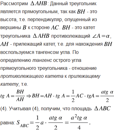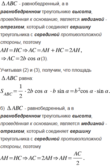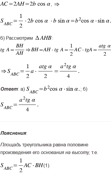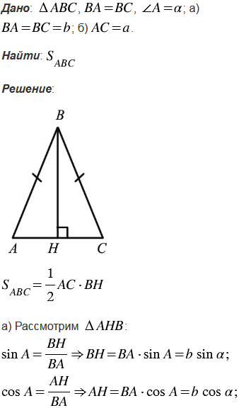 Найдите площадь равнобедренного треугольника с углом при основании, если: а) боковая сторона равна ; б) основание равно .