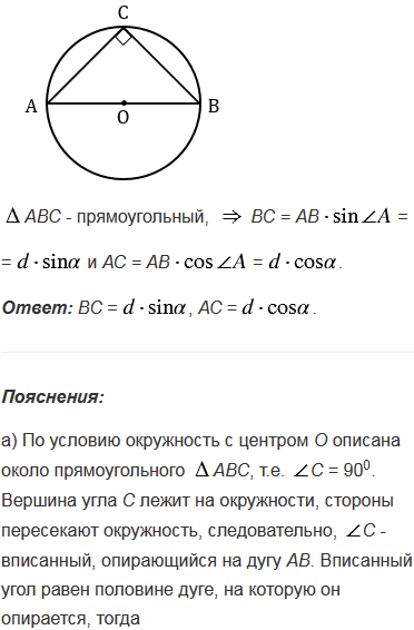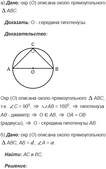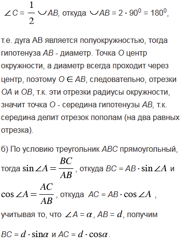 Окружность с центром О описана около прямоугольного треугольника. а) Докажите, что точка О - середина гипотенузы. б) Найдите стороны треугольника, если диаметр окружности равен , а один из острых углов треугольника равен .