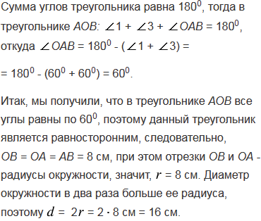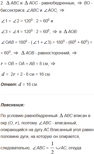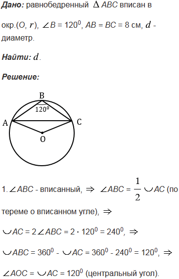 Угол, противолежащий основанию равнобедренного треугольника, равен 1200, боковая сторона треугольника равна 8 см. Найдите диаметр окружности, описанной около этого треугольника.