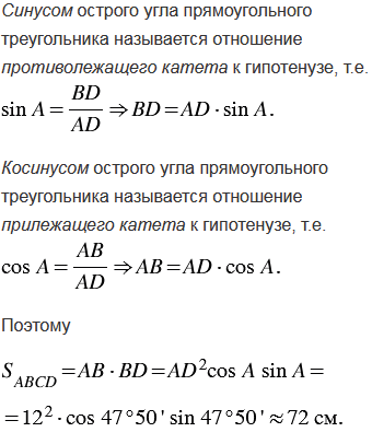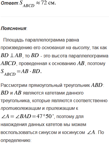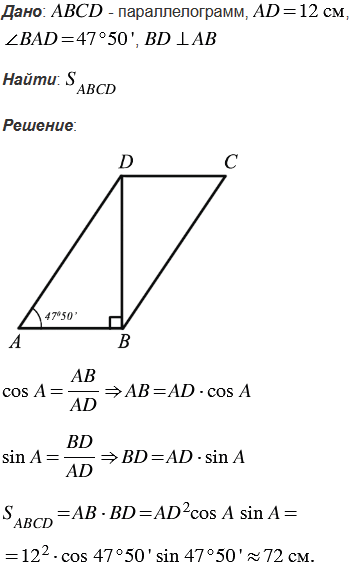 В параллелограмме ABCD сторона AD равна 12 см, а угол BAD равен 47050'. Найдите площадь параллелограмма, если его диагональ BD перпендикулярна к стороне АВ.