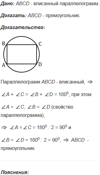Докажите, что если около параллелограмма можно описать окружность, то этот параллелограмм прямоугольник.