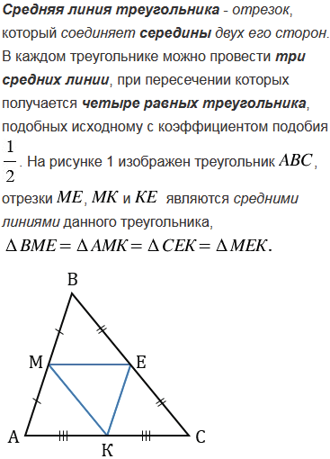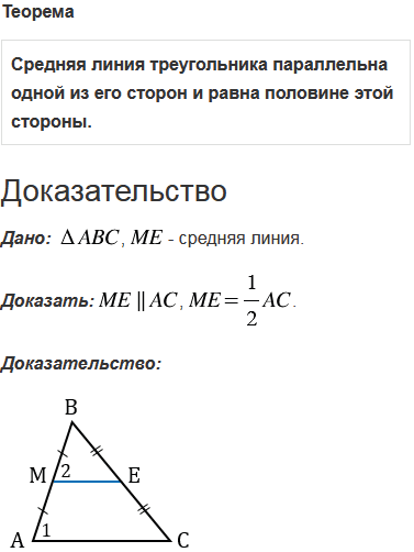 Какой отрезок называется средней линией треугольника? Сформулируйте и докажите теорему о средней линии треугольника.