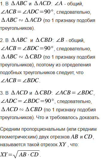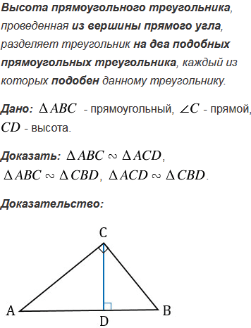 Сформулируйте и докажите утверждение о том, что высота прямоугольного треугольника, проведённая из вершины прямого угла, разделяет треугольник на подобные треугольники.