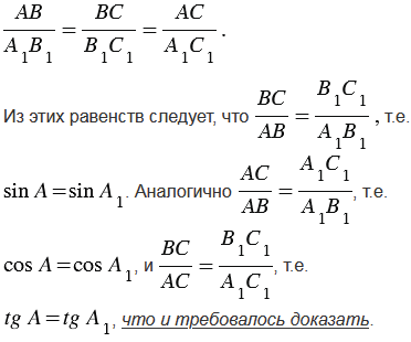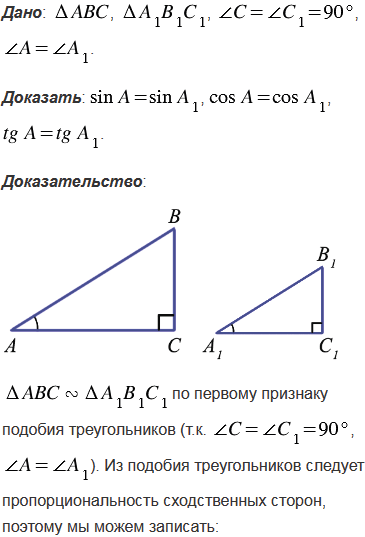 Докажите, что если острый угол одного прямоугольного треугольника равен острому углу другого прямоугольного треугольника, то синусы этих углов равны, косинусы этих углов равны и тангенсы этих углов равны.