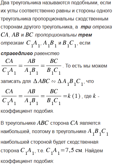 Треугольники АВС и А1В1С1 подобны, АВ = 6 см, ВС = 9 см, СА = 10 см. Наибольшая сторона треугольника А1В1С1 равна 7,5 см. Найдите две другие стороны треугольника А1В1С1.
