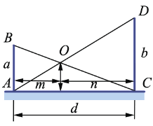 Два шеста АВ и CD разной длины и установлены вертикально на некотором расстоянии друг от друга так, как показано на рисунке 210. Концы А и D, В и С соединены верёвками, которые пересекаются в точке О. По данным рисунка докажите, что: а) ; б) . Найдите и докажите, что не зависит от расстояния между шестами АВ и CD.