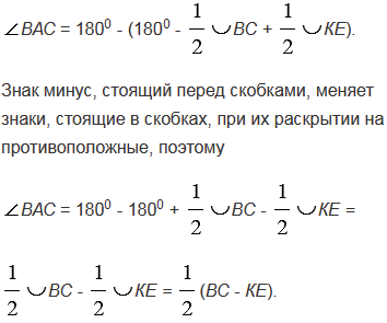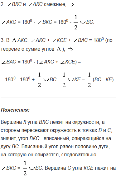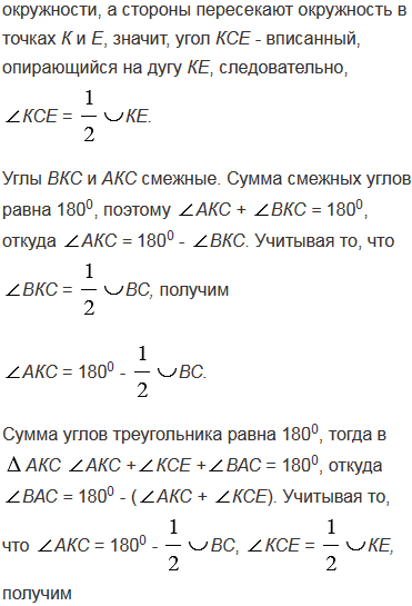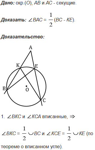 Через точку, лежащую вне окружности, проведены две секущие. Докажите, что угол между ними измеряется полуразностью дуг, заключенных внутри угла.