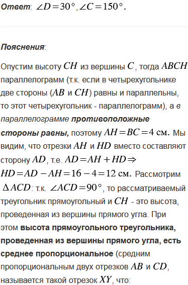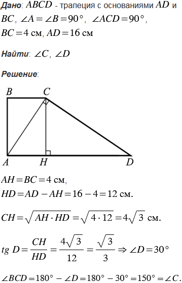 ACD = 900, ВС = 4 см, AD = 16 см. Найдите углы С и D трапеции.