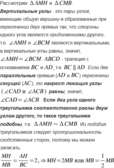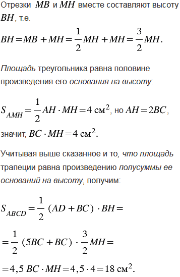 Основание AD равнобедренной трапеции ABCD в 5 раз больше основания ВС. Высота ВН пересекает диагональ АС в точке М, площадь треугольника АМН равна 4 см2. Найдите площадь трапеции ABCD.