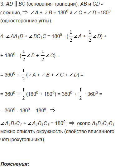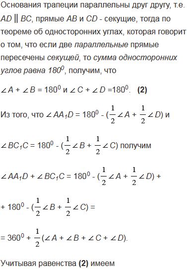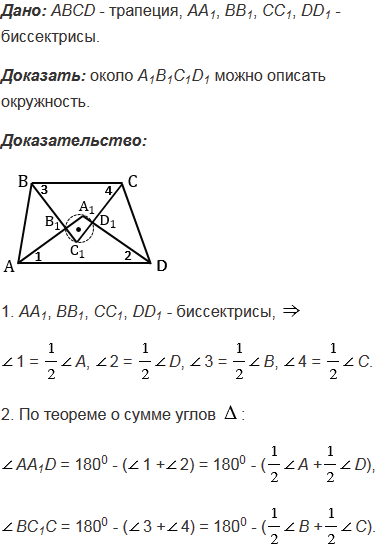 Докажите, что около выпуклого четырехугольника, образованного при пересечении биссектрис углов трапеции, можно описать окружность.
