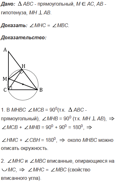 В прямоугольном треугольнике АВС из точки М стороны АС проведен перпендикуляр МН к гипотенузе АВ. Докажите, что углы МНС и МВС равны.