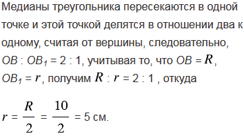 Найдите радиус вписанной в равносторонний треугольник окружности, если радиус описанной окружности равен 10 см.