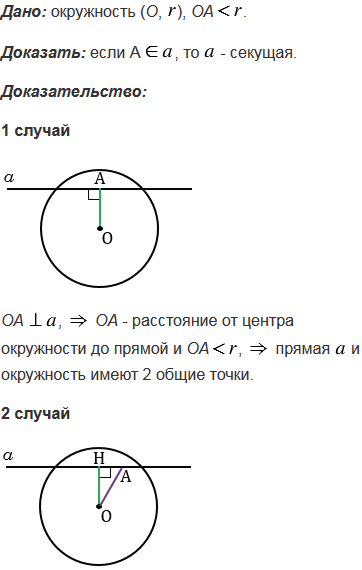 Расстояние от точки А до центра окружности меньше радиуса окружности. Докажите, что любая прямая, проходящая через точку А, является секущей по отношению к данной окружности.