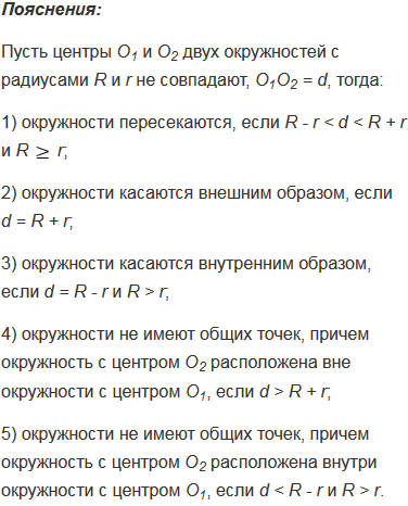 Определите взаимное расположение двух окружностей, радиусы которых равны 5 и 9, если расстояние между их центрами равно: а) 16; б) 14; в) 7; г) 4.