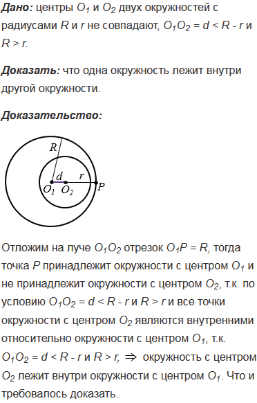 Докажите утверждение 5 из теоремы о взаимном расположении окружностей: если расстояние между центрами двух окружностей с неравными радиусами меньше разности радиусов, то одна окружность лежит внутри другой окружности.