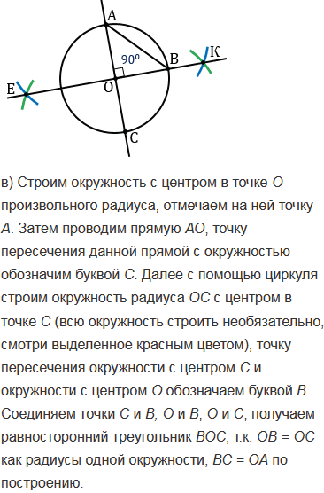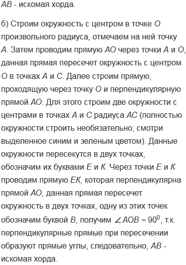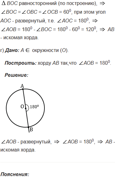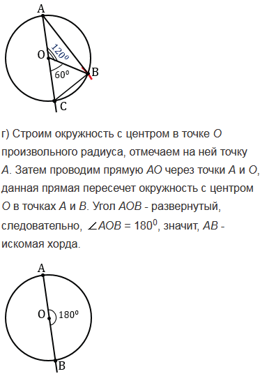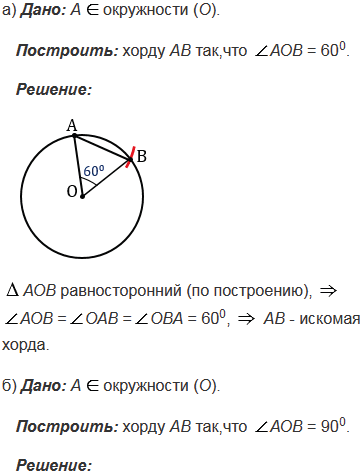 Начертите окружность с центром О и отметьте на ней точку А. Постройте хорду АВ так, чтобы: а) АОВ = 600; б) АОВ = 900; в) АОВ = 1200; г) АОВ = 1800.