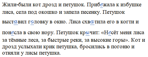 Жили-были кот дрозд и петушок. Приб_жала к избушке лиса села под окошко и запела песенку. Петушок выст_вил г_ловку в окно. Лиса схв_тила его в когти и пон_сла в свою нору. Петушок кр_чит: «Н_сёт меня лиса за тёмные леса за быстрые реки за высокие горы». Кот и дрозд услыхали крик петушка бросились в погоню и отняли у лисы петушка.