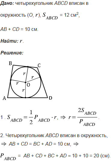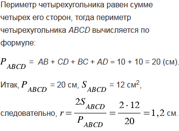 Сумма двух противоположных сторон описанного четырехугольника равна 10 см, а его площадь - 12 см2. Найдите радиус окружности вписанной в этот четырехугольник.