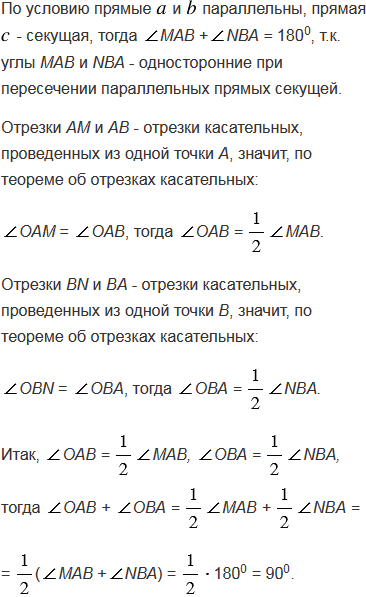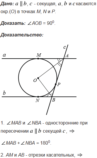 Окружность касается двух параллельных прямых и их секущей. Докажите, что отрезок секущей, заключённый между параллельными прямыми, виден из центра окружности под прямым углом (см. п.41).