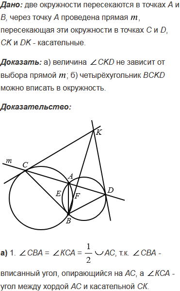 , пересекающая эти окружности в точках С и D. Через точки С и D проведены касательные к окружностям, пересекающиеся в точке K. Докажите, что: а) величина угла СKD не зависит от выбора прямой