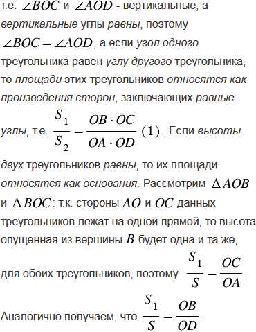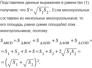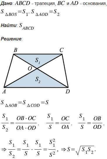 Диагонали трапеции ABCD с основаниями ВС и AD пересекаются в точке О. Площади треугольников ВОС и AOD равны S1 и S2. Найдите площадь трапеции.