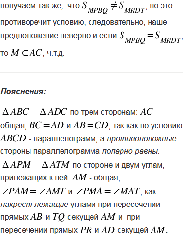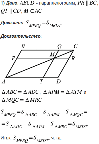 Через точку М, лежащую внутри параллелограмма ABCD, проведены прямые, параллельные его сторонам и пересекающиеся сторона АВ, ВС, CD и DA соответственно в точках Р, Q, R и Т. Докажите, что если точка М лежит на диагонали АС, то площади параллелограммов MPBQ и MRDT равны и, обратно, если площади параллелограммов MPBQ и MRDT равны, то точка М лежит на диагонали АС.