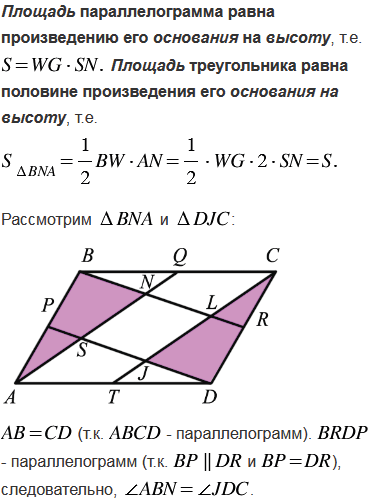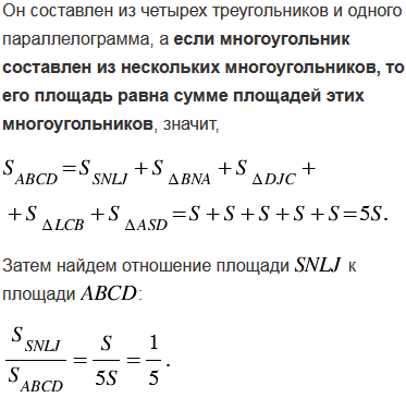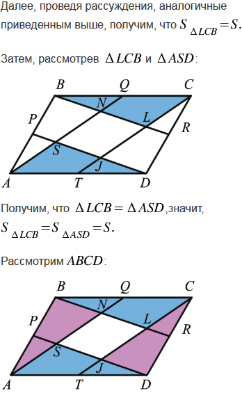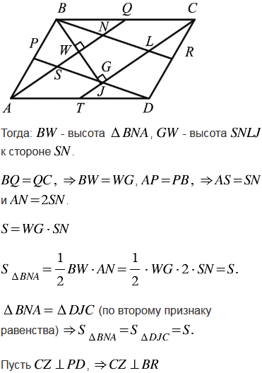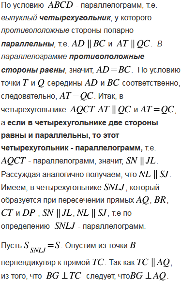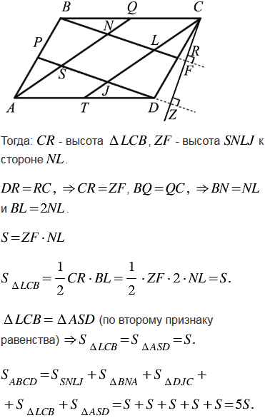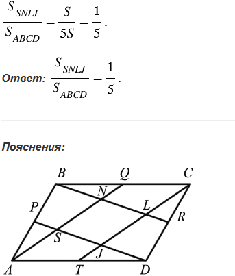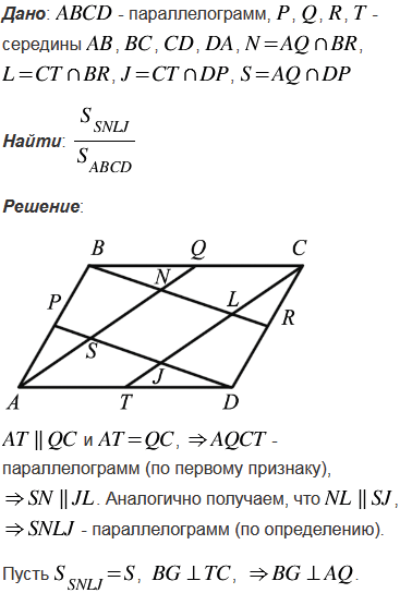 Точки P, Q, R и Т соответственно - середины сторон АВ, ВС, CD и DA параллелограмма ABCD. Докажите, что при пересечении прямых AQ, BR, СТ и DP образуется параллелограмм, и найдите отношение его площади к площади параллелограмма ABCD.