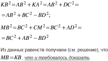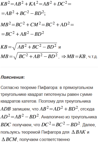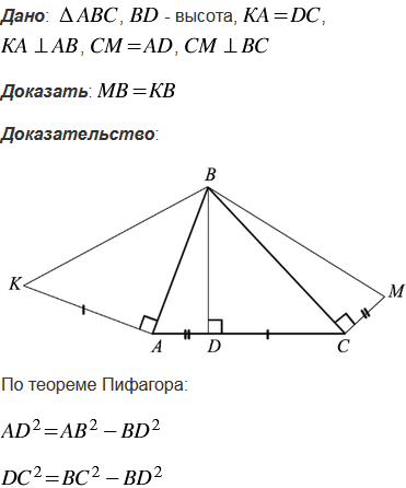 В треугольнике АВС проведена высота BD. Отрезок КА перпендикулярен к отрезку АВ и равен отрезку DC, отрезок СМ перпендикулярен к отрезку ВС и равен отрезку AD. Докажите, что отрезки МВ и КВ равны.