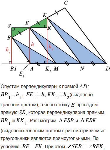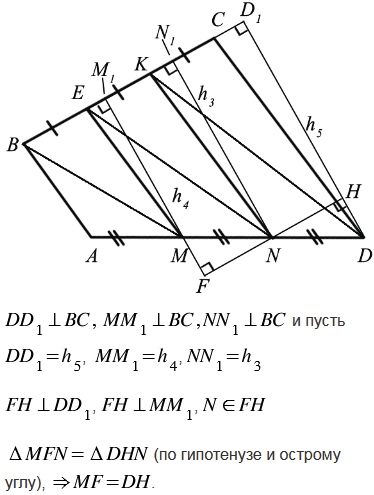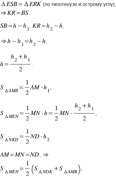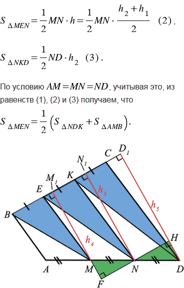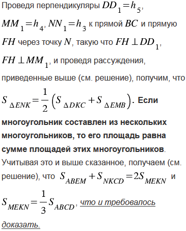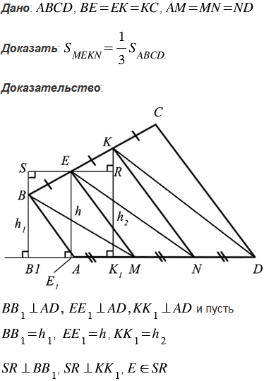Два непересекающихся отрезка делят каждую из двух противоположных сторон выпуклого четырёхугольника на три равные части. Докажите, что площадь той части четырёхугольника, которая заключена между этими отрезками, в три раза меньше площади самого четырёхугольника.
