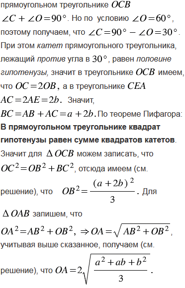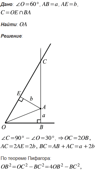 Точка А лежит внутри угла, равного 600. Расстояния от точки А до сторон угла равны и . Найдите расстояние от точки А до вершины угла.