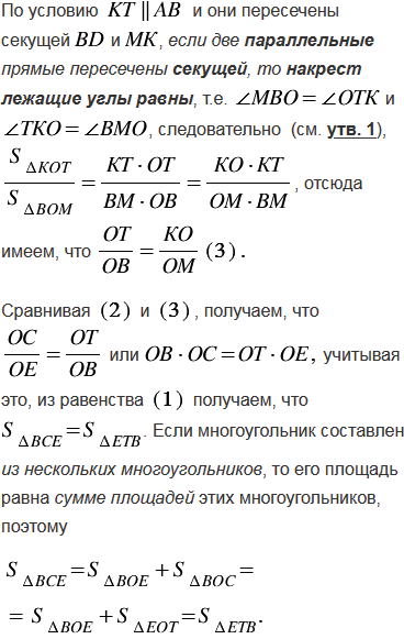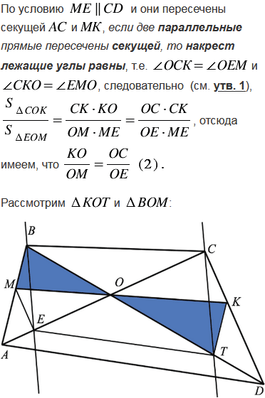 Через точку пересечения диагоналей четырёхугольника ABCD проведена прямая, пересекающая отрезок АВ в точке М и отрезок CD в точке К. прямая, проведённая через точку К переллельно отрезку АВ, пересекает отрезок ВD в точке Т, а прямая, проведённая через точку М параллельно отрезку CD, пересекает отрезок АС в точке Е. Докажите, что прямые ВЕ и СТ параллельны.