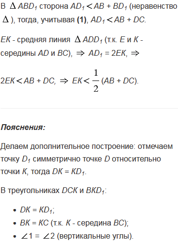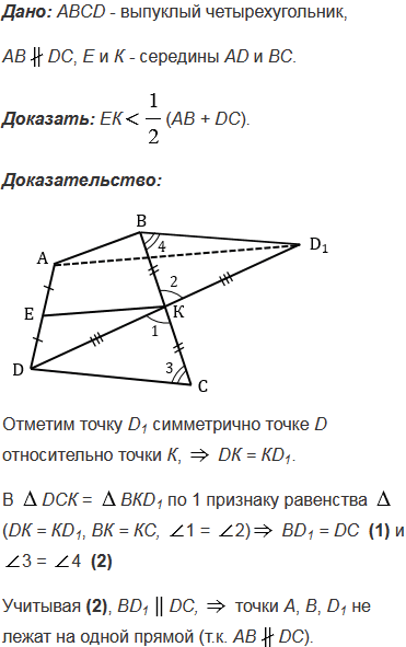 Докажите, что если противоположные стороны выпуклого четырехугольника не параллельны, то их полусумма больше отрезка, соединяющего середины двух других противоположных сторон.