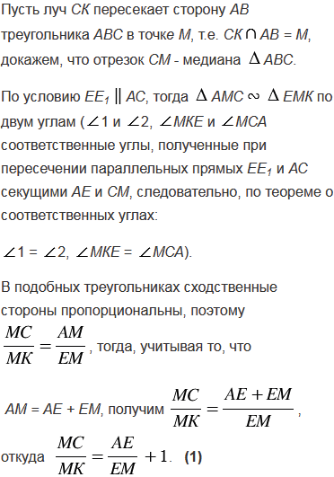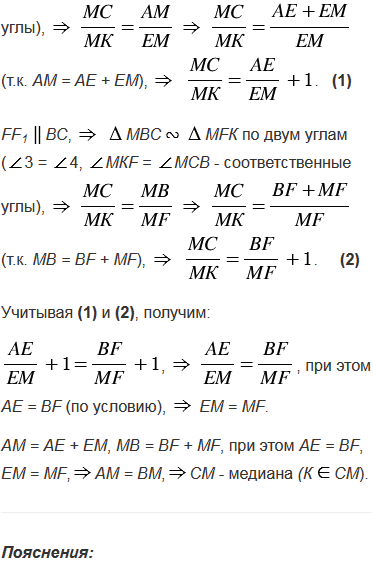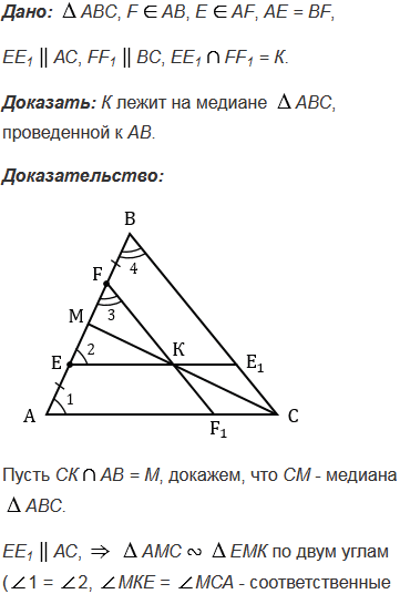Точки Е и F лежат на стороне АВ треугольника АВС, причем точка Е лежит на отрезке АF и АЕ = BF. Прямая, проведенная через точку Е параллельно стороне АС, пересекает прямую, проведенную через точку F параллельно стороне ВС, в точке К. Докажите, что точка К лежит на медиане треугольника АВС, проведенной к стороне АВ.
