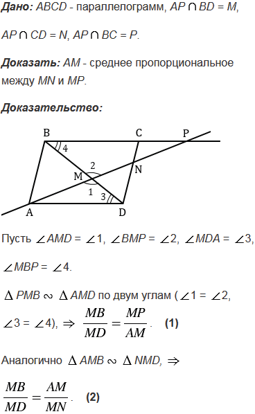 Через вершину А параллелограмма АВСD проведена прямая, пересекающая прямые ВD, СD и ВС соответственно в точках М, N и Р. Докажите, что отрезок АМ является средним пропорциональным между МN и МР.