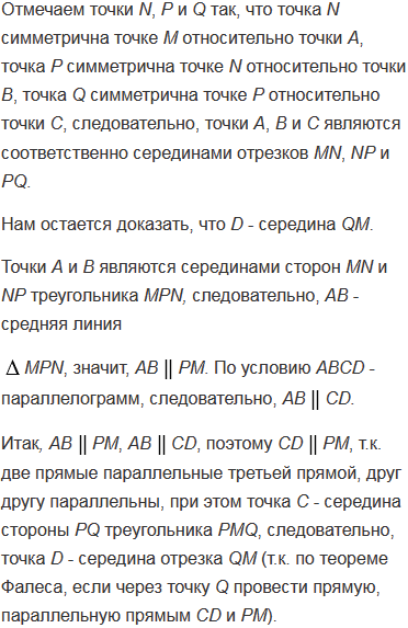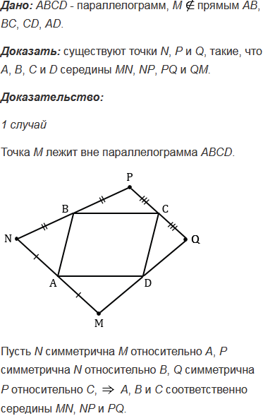 Точка М не лежит на прямых, содержащих стороны параллелограмма АВСD. Докажите, что существуют точки N, Р и Q, расположенные так, что А, В, С и D являются соответственно серединами отрезков МN, NР, РQ и QМ.