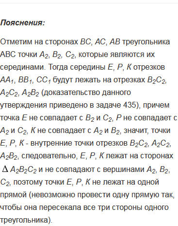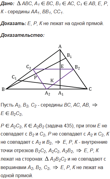 Отрезки АА1, ВВ1 и СС1 соединяют вершины треугольника АВС с внутренними точками противоположных сторон. Докажите, что середины этих отрезков не лежат на одной прямой.
