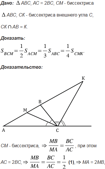 В треугольнике АВС, сторона АС которого в 2 раза больше стороны ВС, проведены биссектриса СМ и биссектриса внешнего угла при вершине С, пересекающая прямую АВ в точке К. Докажите, что