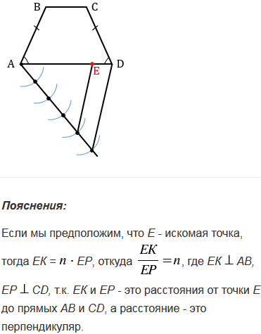 Постройте точку, принадлежащую большему основанию равнобедренной трапеции и отстоящую от данной боковой стороны в раз дальше, чем от другой ( = 2, 3, 4).