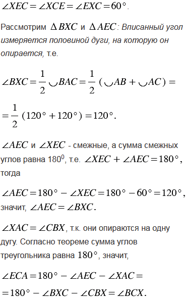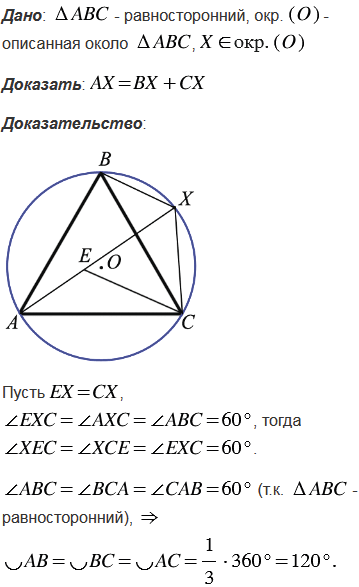 Произвольная точка Х окружности, описанной около равностороннего треугольника АВС, соединена отрезками с его вершинами. Докажите, что один из отрезков АХ, ВХ и СХ равен сумме двух других отрезков.