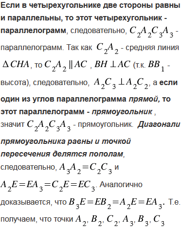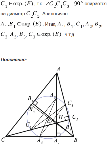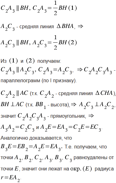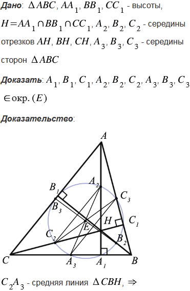 Для неравностороннего треугольника АВС точка О является центром описанной окружности, Н - точка пересечения прямых, содержащих высоты АА1, ВВ1 и СС1, точки А2, В2, С2 - середины отрезков АН, ВН, СН, а точки А3, В3, С3 - середины сторон треугольника АВС. Докажите, что точки А1, В1, С1, А2, В2, С2, А3, В3, С3 лежат на одной окружности (окружность Эйлера).