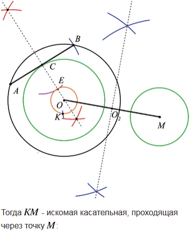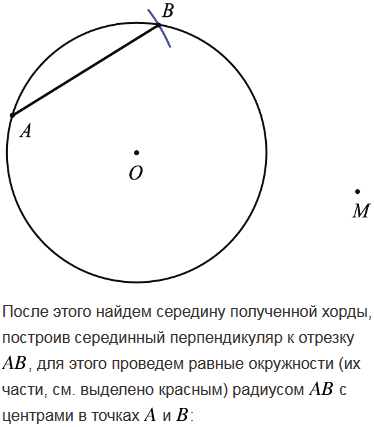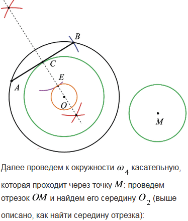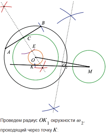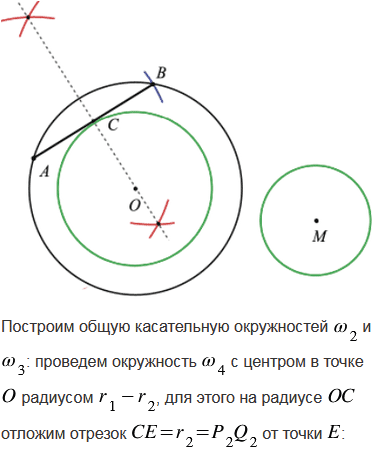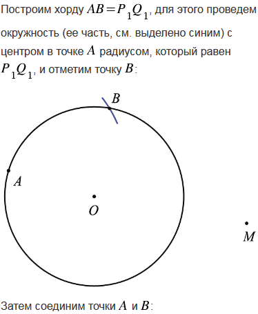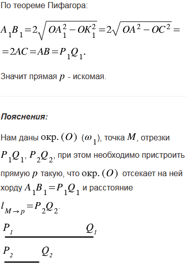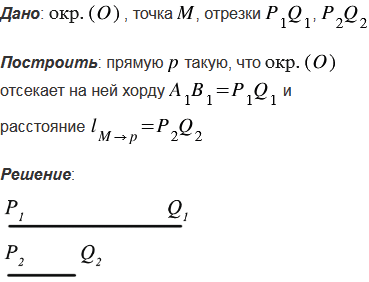 Даны окружность с центром О, точка М и отрезки P1Q1  и P2Q2. Постройте прямую p так, чтобы окружность отсекла на ней хорду, равную P1Q1, и расстояние от точки М по прямой p равнялось P2Q2.