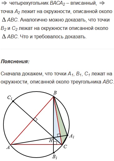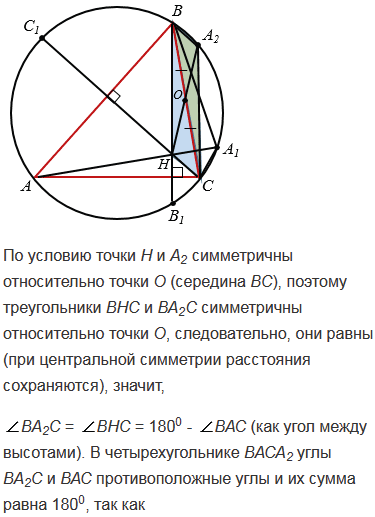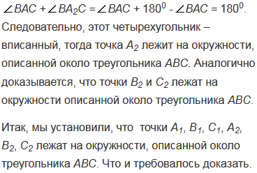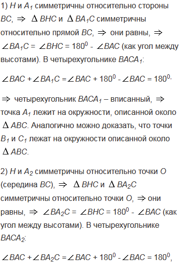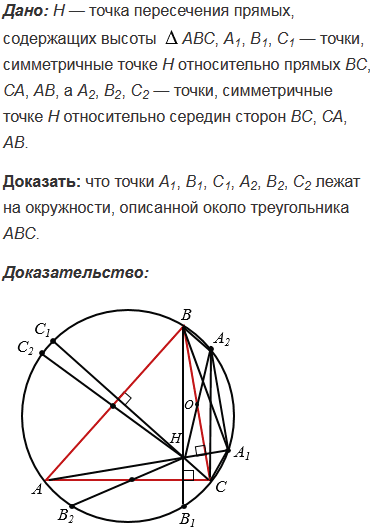 Пусть Н точка пересечения прямых, содержащих высоты треугольника АВС, А1, В1, С1 точки, симметричные точке Н относительно прямых ВС, СА, АВ, а А2, В2, С2 точки, симметричные точке Н относительно середин сторон ВС, СА, АВ. Докажите, что точки А1, В1, С1, А2, В2, С2 лежат на окружности, описанной около треугольника АВС.