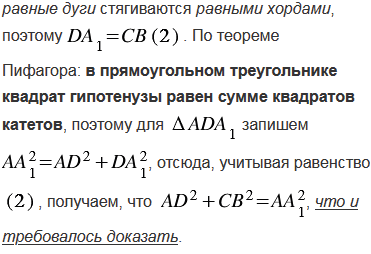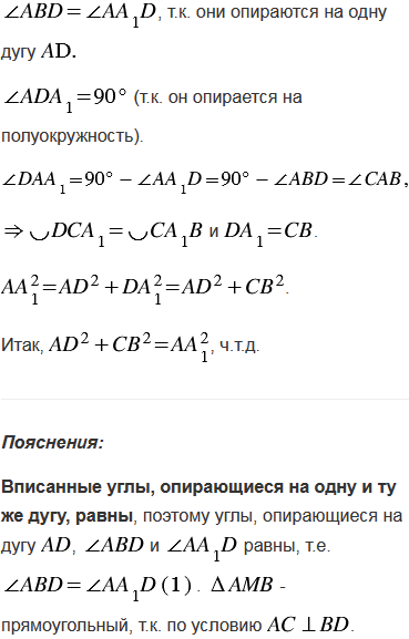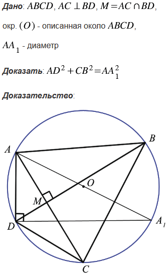 Докажите, что если диагонали вписанного четырёхугольника перпендикулярны, то сумма квадратов противоположных сторон четырёхугольника равна квадрату диаметра описанной окружности.