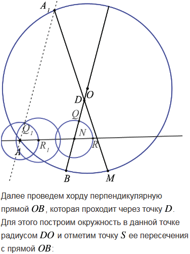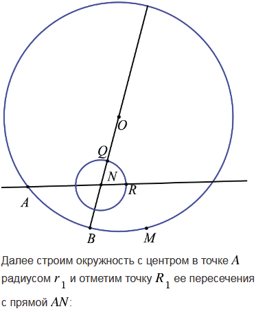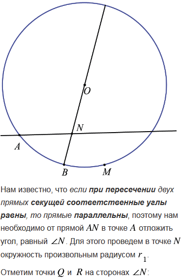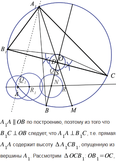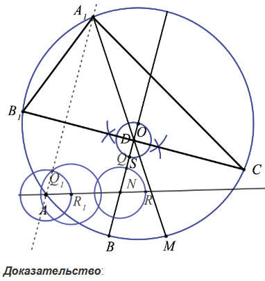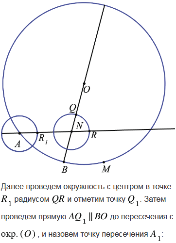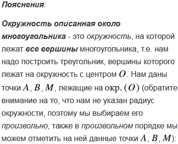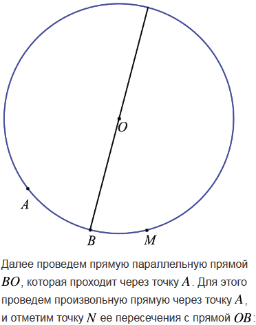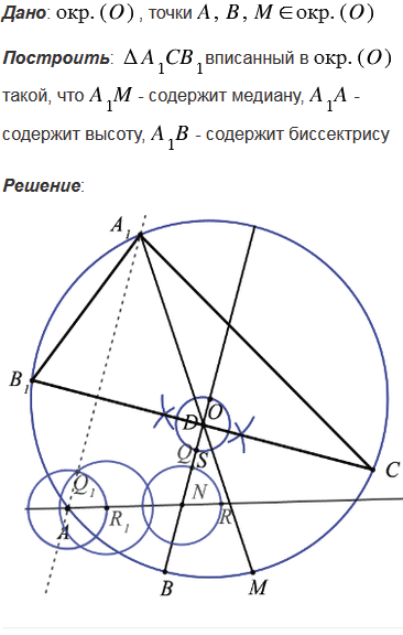 Постройте треугольник, если дана описанная окружность и на ней точки А, В и М, через которые проходят прямые, содержащие высоту, биссектрису и медиану треугольника, проведённые из одной вершины.