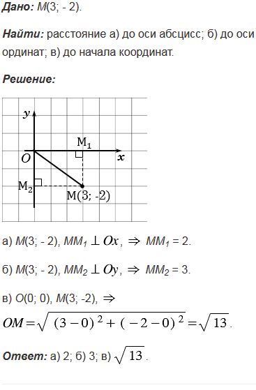 Найдите расстояние от точки М(3; - 2): а) до оси абсцисс; б) до оси ординат; в) до начала координат.